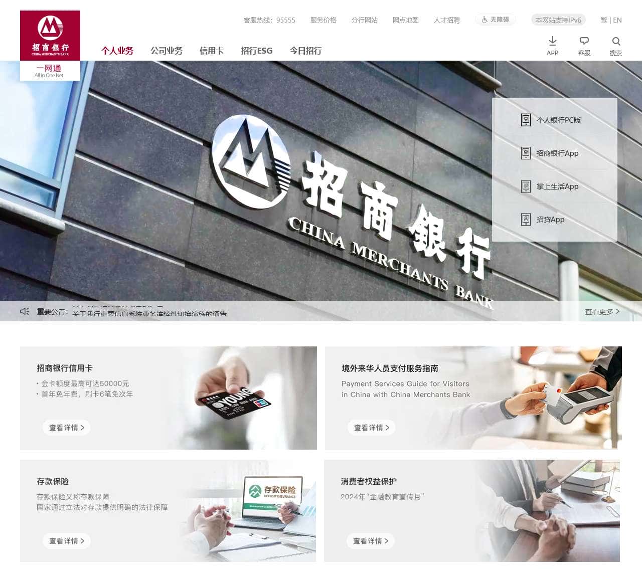 招商银行官方网站。办理卡片申请,智能存款,转账汇款,网上支付,投资理财,贷款消费,信用卡还款,生活缴费,外汇买卖,实时利率,汇率查询,公司理财,企业贷款等业务,享受一站式综合金融服...