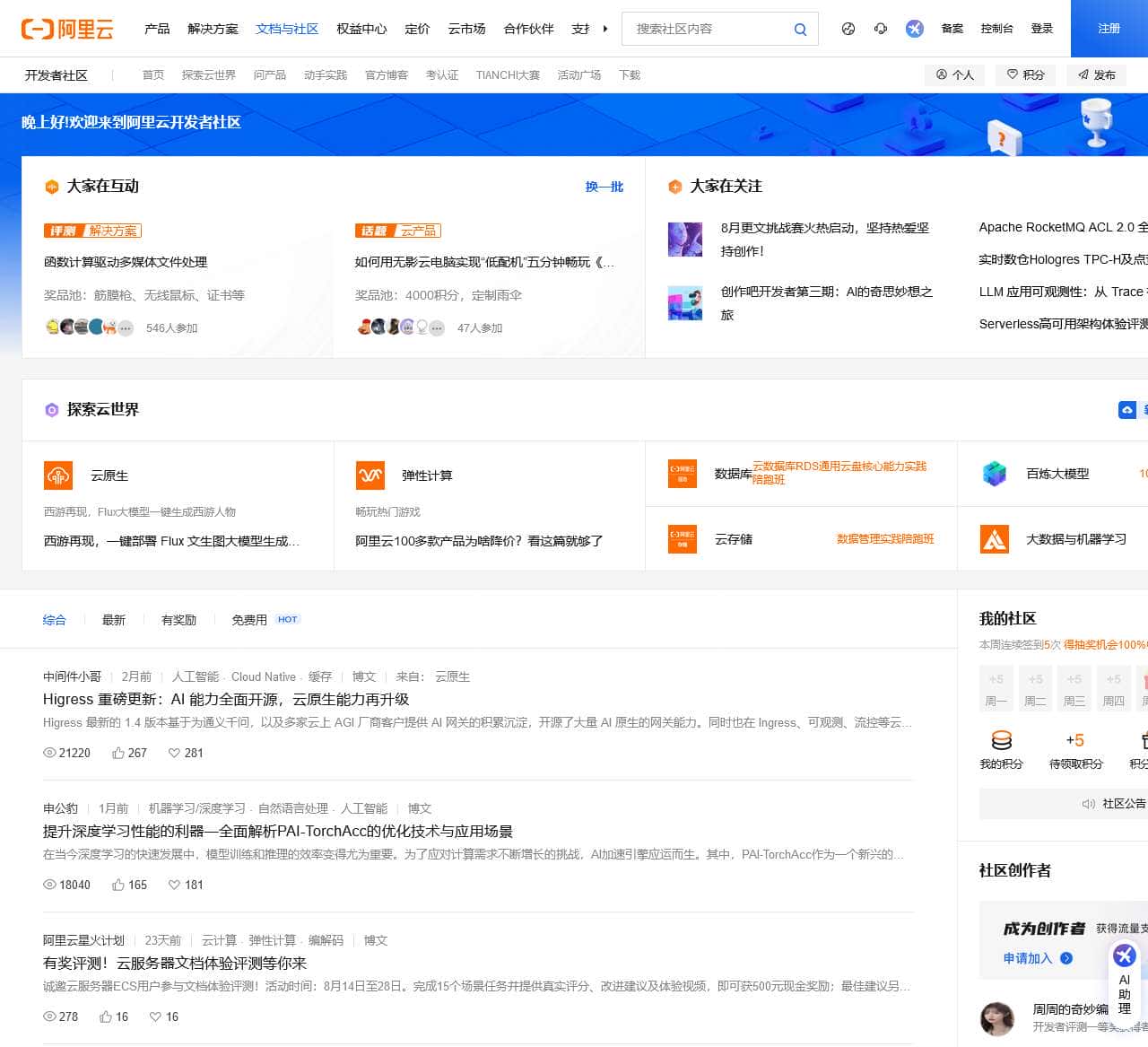 | 官方博客 | 考认证 | TIANCHI大赛 | 任务中心做任务,得社区积分和周边 | 高校计划 | 让每位学生受益于普惠算力 | 训练营资深技术专家手把手带教 | 话题畅聊无限,分享你的技术见解 |