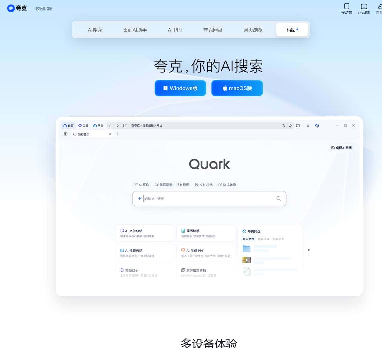 夸克pc/app为你带来极速、智能、安全、高效的搜索体验,找答案,找资料,找工具,办公,学习,工作必备应用。夸克提供浏览器搜索引擎、网盘、AI扫描王工具及小说阅读等高效功能,为你提供稳定,安全,流畅的浏览环境和优质的产品服务体验