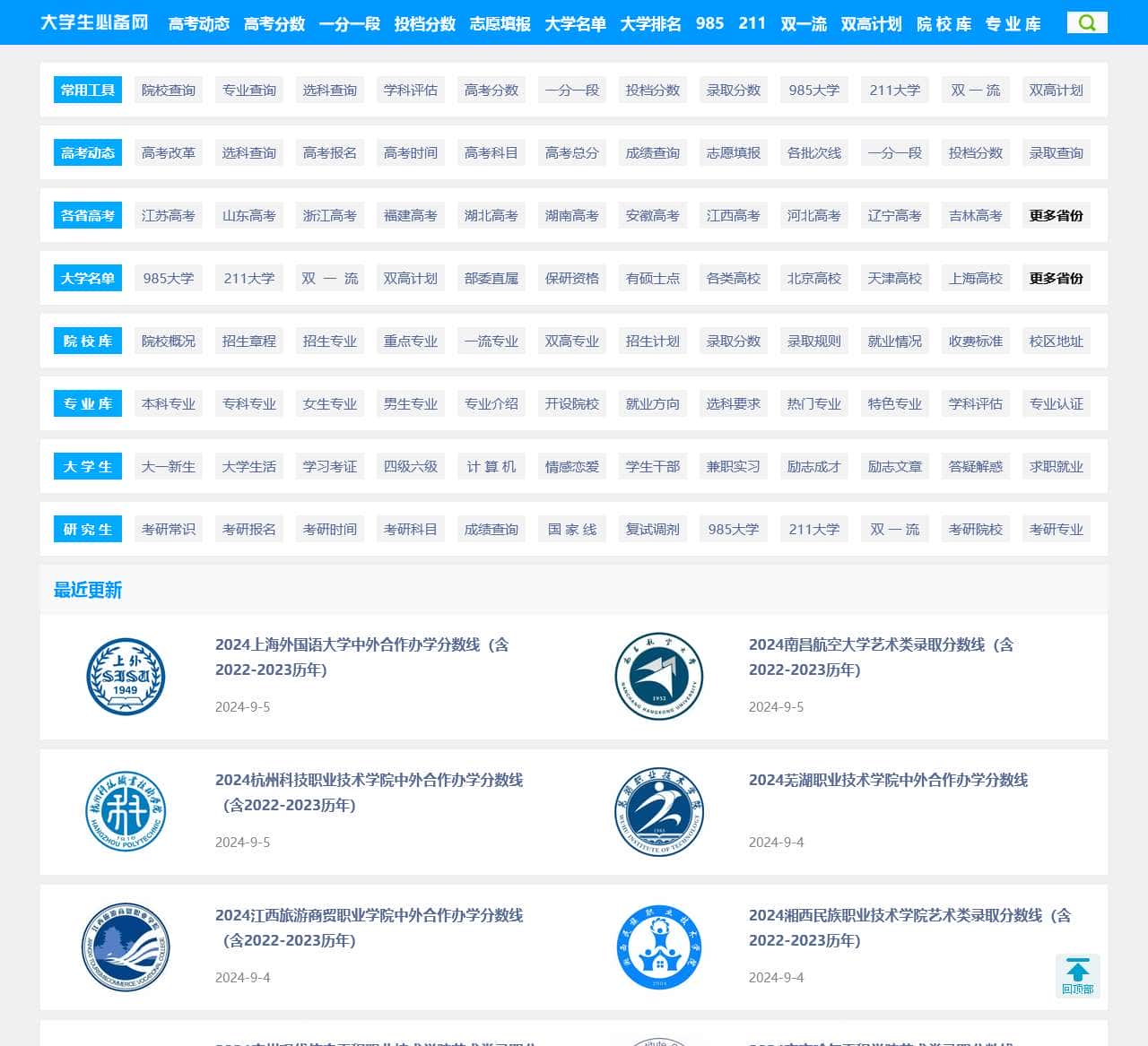 | 高考动态 | 高考分数、 一分一段、 投档分数、 志愿填报、 大学名单、 大学排名、 985、 211、 双一流、 双高计划 |