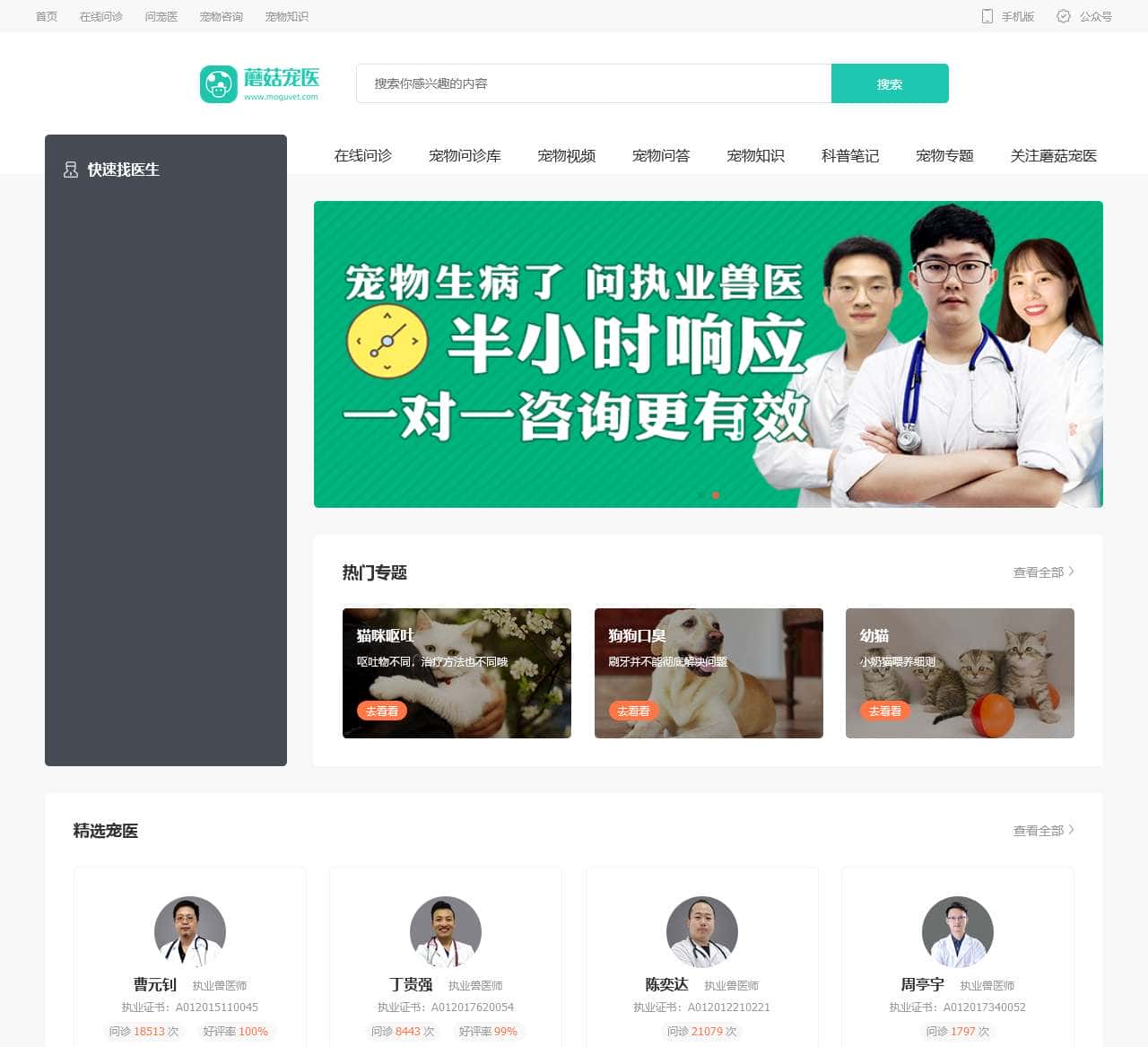 宠物医生在线咨询,就上蘑菇宠医,这里有资深兽医在线咨询和解答,为有宠物医疗需求的宠主提供宠物医院医生在线问诊服务,还提供宠物饲养知识,宠物日常用品与药品购买,宠物医疗常识等。