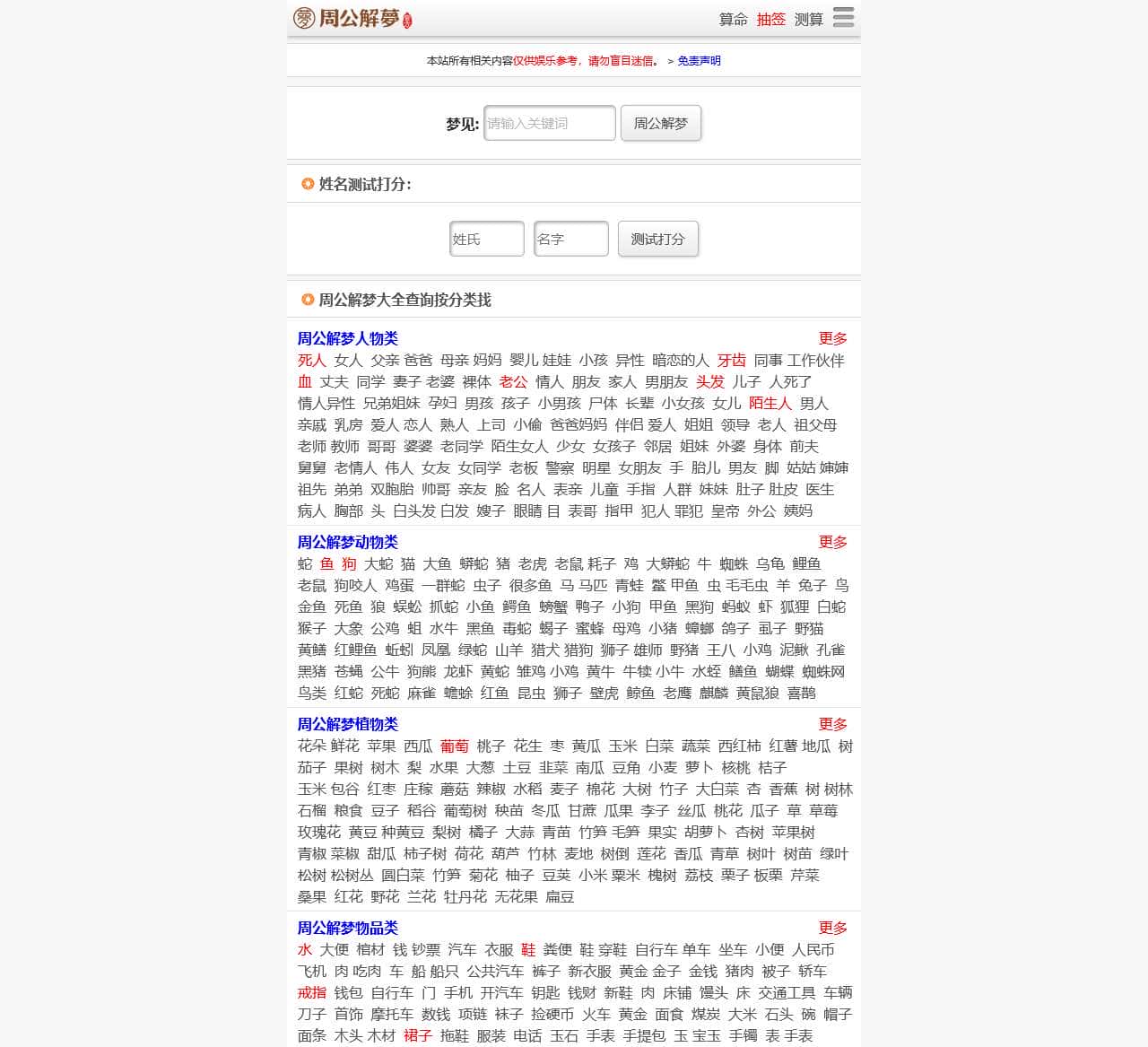 | 算命 | 抽签、测算、返回首页、周公解梦、十二生肖、血型性格、姓名测试、风水知识、收起、免责声明、姓名测试打分、更多 |