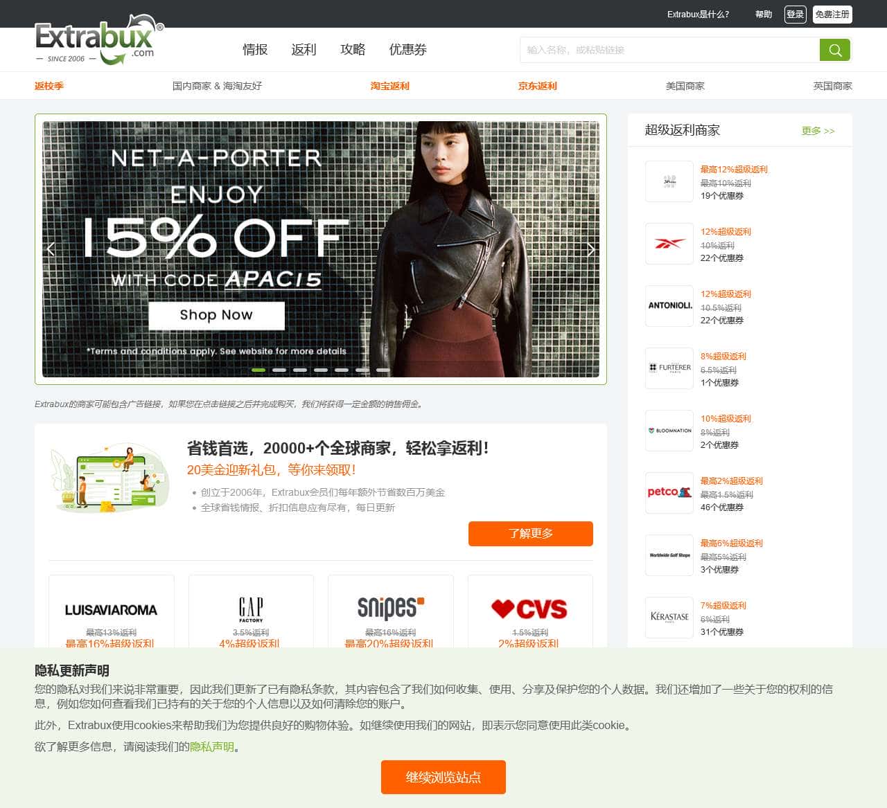 Extrabux 是一家专业的全球购物返利网站,与超过10000+家商户合作,提供高达30%的海淘返利。海量的购物指南,海淘攻略,折扣优惠,涵盖服饰箱包,美容护肤,营养保健等多个品类,让你轻松购物无忧虑。免费注册,获得20美金迎新奖励,开始行动吧!