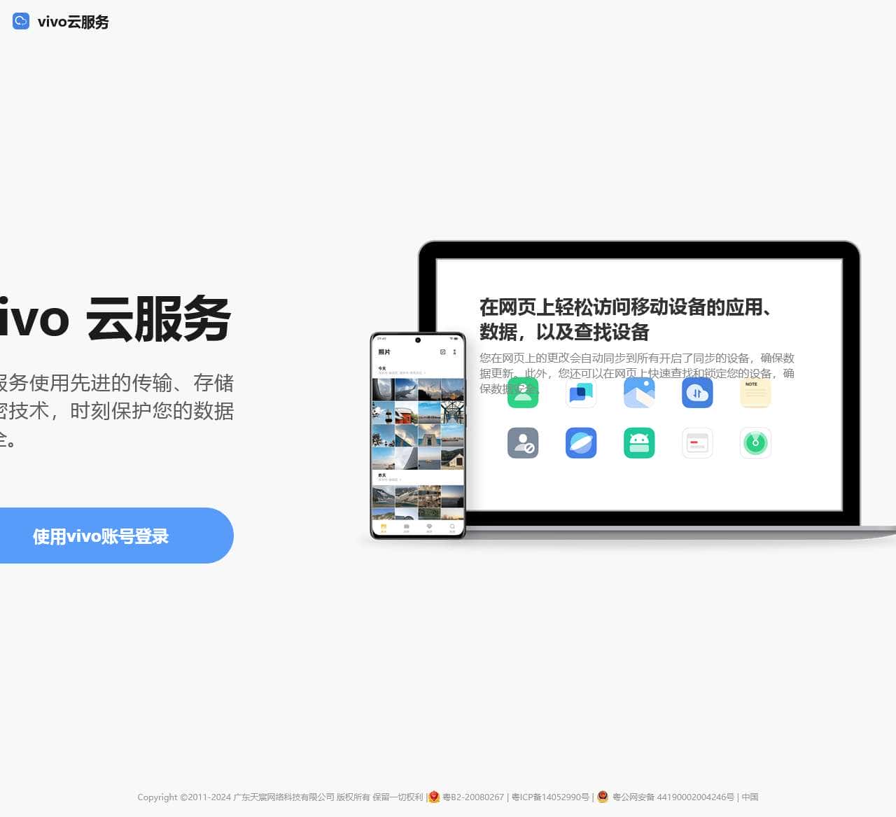 vivo云服务为您提供文件备份、数据同步、查找手机等功能。您可以在线管理照片、视频、联系人、短信、便签等重要数据,也可以在线定位、锁定您的手机。