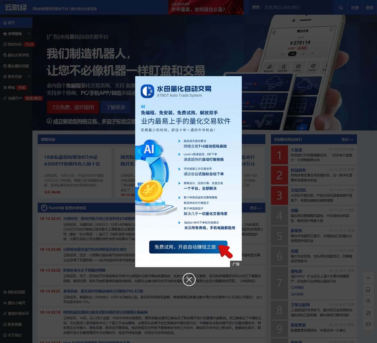 云财经是专业的股市行情、资讯聚合、自动交易平台,汇聚全网最新股票内参和热点题材,独创多种资金指标,更有股票全自动交易模块,助力实现量化交易。把握今日股市行情,就上云财经!