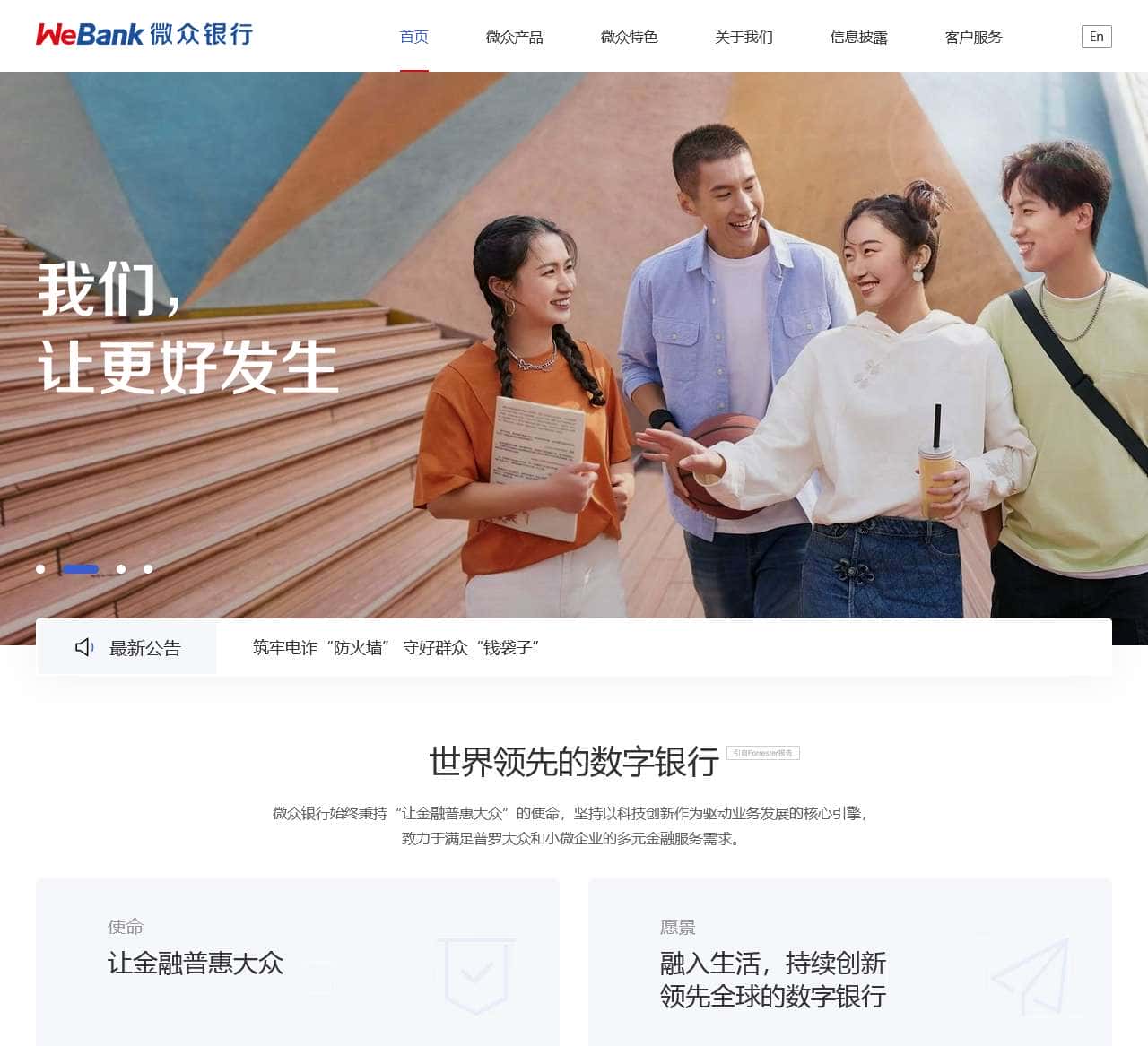 作为以科技为核心发展引擎的数字银行,微众银行专注为小微企业和普罗大众提供差异化、有特色、优质便捷的金融服务。国际知名独立研究公司Forrester定义微众银行为“世界领先的数字银行”。