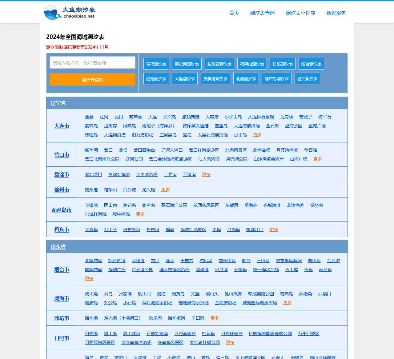 大鱼潮汐表是专业提供精准潮汐时间表查询服务的网站,包含涨潮时间和退潮时间以及全国海域最新潮汐表预报和历史潮汐表数据,查潮汐就用大鱼潮汐表。