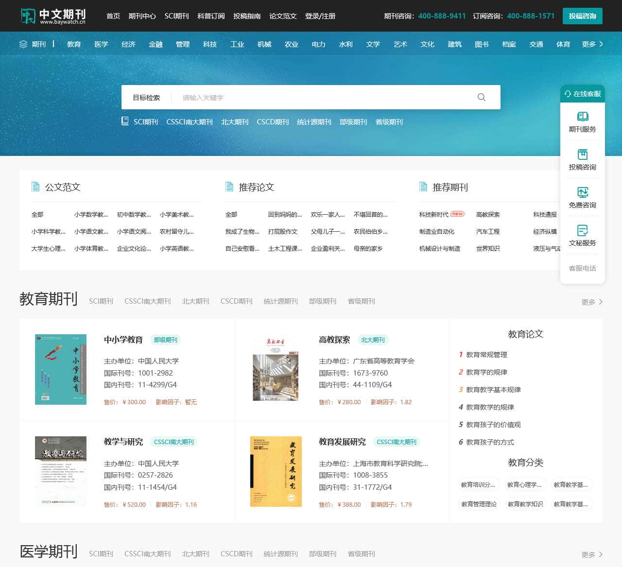 | 期刊类别 | 教育, 医学, 经济, 金融, 管理, 科技, 工业, 机械, 农业, 电力, 水利, 文学, 艺术, 文化, 建筑, 图书, 档案, 交通, 体育, 更多 |