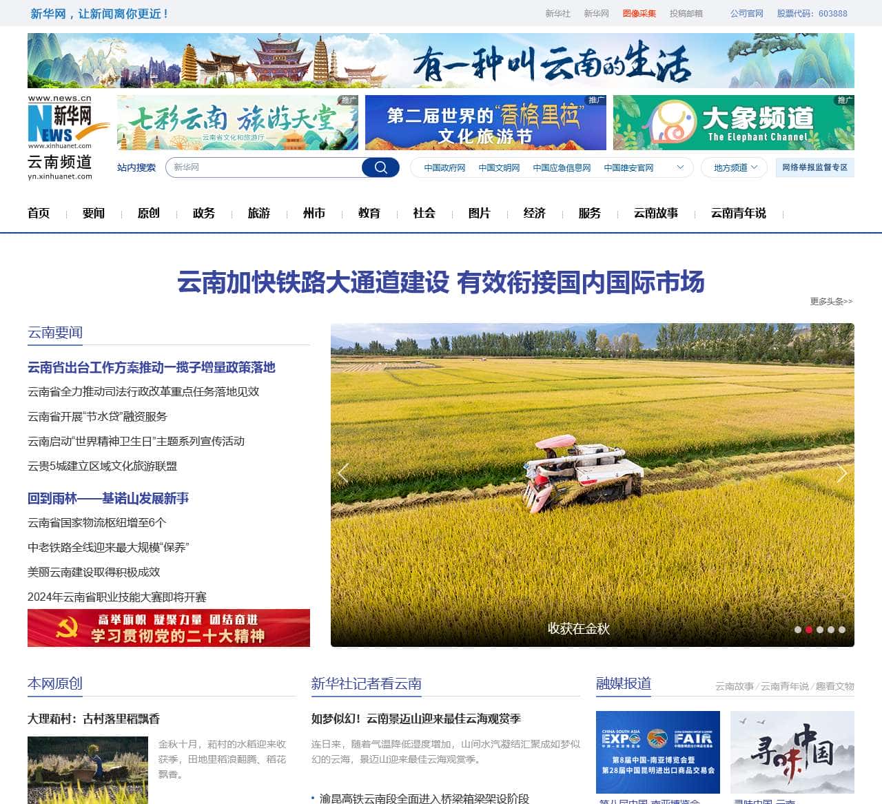| 活动与动态 | 倒计时1天!收获在金秋;玛睿的Vlog·云南户外行|辽阔而壮美!迪庆徒步体验原来这样爽!乡村振兴在行动|云南安宁:汇聚力量,为温泉产业发展注入新动能;昆明特色文旅活动,释放消费新活力;本网原创,大理萂村:古村落里稻飘香;云南巧家:延时摄影记录翠芦莉绽放绚丽瞬间;摄影爱好者延时摄影记录朱槿盛开瞬间;玉溪市2023年全市生产总值达2564.8亿元;昆明磨憨:文商旅活动丰富,国门假期热度高;延时摄影记录玫瑰花开,感受一场视觉盛宴;新华社记者看云南,如梦似幻!云南景迈山迎来最佳云海观赏季;渝昆高铁云南段全面进入桥梁箱梁架设阶段;一座特殊的矿区“守望台”;“老年幸福食堂”温暖银龄岁月;中国侨联海外华文媒体采访行走进云南;通讯|中老合作推动老挝医疗水平不断提升;岁月追思,绿色传承——杨善洲老书记逝世十四周年;擅闯哀牢山保护区最高罚款5000元!当地发出提醒;融媒报道,趣看文物,云南青年说/云南故事/第八届中国-南亚博览会;寻味中国·云南,来大理茈碧湖,邂逅参差荇菜;云南怒江:稻田成熟大地染金,航拍“丰”景如画;云南:工业互联网赋能企业“提智向新”;图解|“数读”彩云之南75载璀璨征途;五百亩金黄来袭!云南这幅秋日丰收画卷尽显壮阔 |