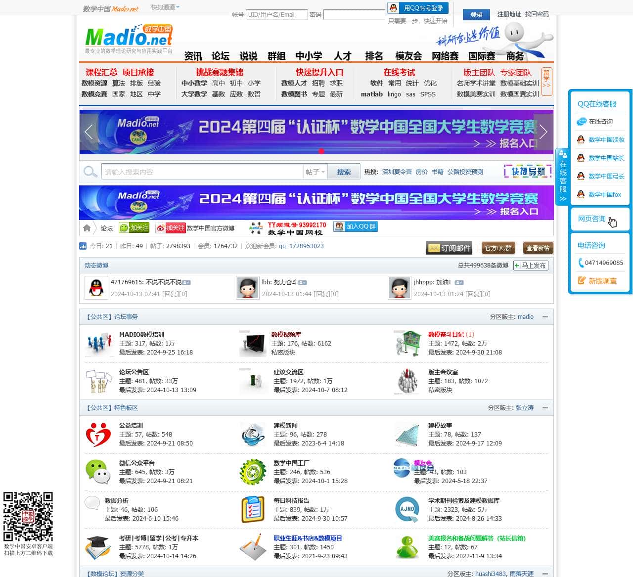 数学中国网站是以数学中国社区为主体的综合性学术社区,下分建模、编程、学术理论、工程应用等版块。从2003年11月建站以来一直致力于数学建模的普及和推广工作,目前已经发展成国内会员最多,资源最丰富,流量最大的数学建模网络平台。我们始终秉承服务大众的理念,坚持资源共享、共同进步的原则,努力营造出严肃、认真、务实、合作的学术氛围,为中国数学的发展做出应有的贡献。 ,数学建模社区-数学中国