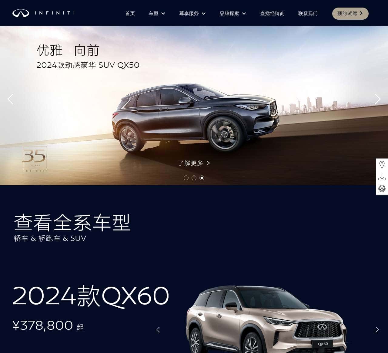 欢迎来到英菲尼迪豪华车中国官网,在这里您能查看我们的轿车、轿跑车、混合动力车以及SUV等全系列车型、查找中国经销商,了解我们的服务,以及最新活动动态等。