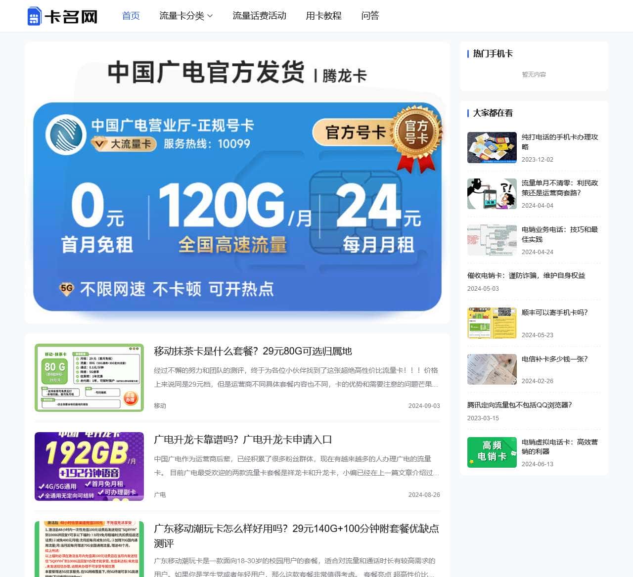 卡名网是专业的号卡套餐评测和办理服务网站,为用户提供移动联通电信流量卡,通话卡和套餐的全面评测,包含号卡套餐详情、办理入口、常见问题等,为您寻找高性价比的号卡套餐。