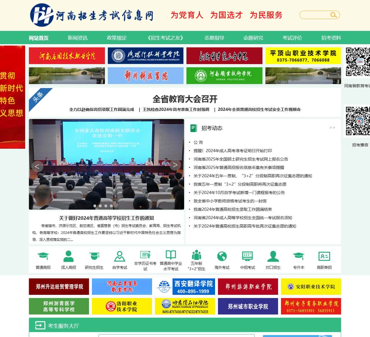 | 河南省2025年全国硕士研究生招生考试网上报名公告 | 河南省2025年普通高招报名信息采集有关事项提醒 | 关于2024年五年一贯制、“3+2”分段制高职再次征集志愿的通知 | 我省五年一贯制“3+2”分段制高职将再次征集志愿 | 关于2024年10月自学考试新增一门课程报考的公告 | 致全省中小学教师资格考试考生的一封信 |