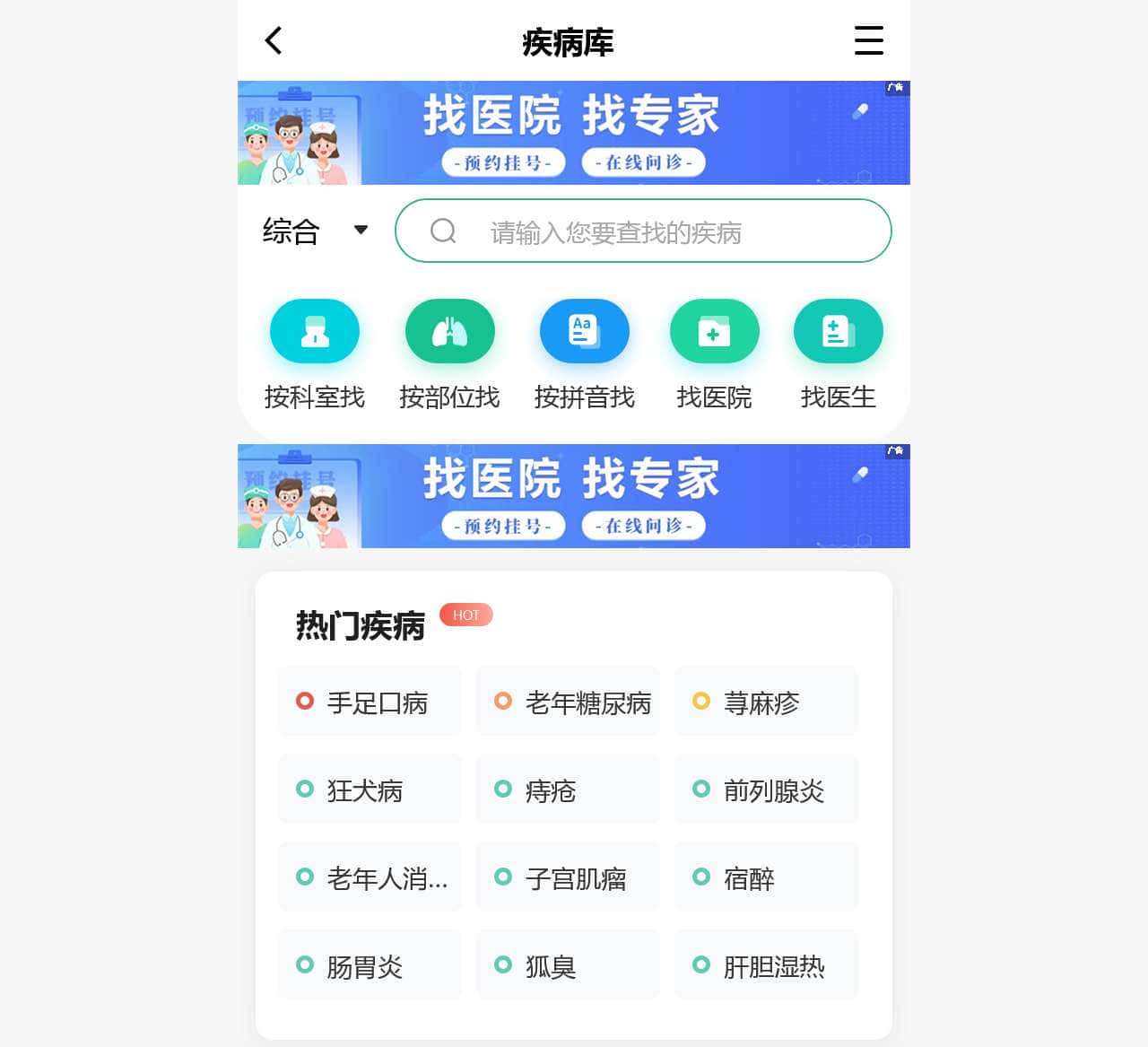 | 科室 | 内科、外科、男科、妇科、眼科、儿科、耳鼻喉科、肿瘤科、消化内科、肛肠科、精神心理科、心脑血管、口腔科、皮肤性病科、营养科、其它 |