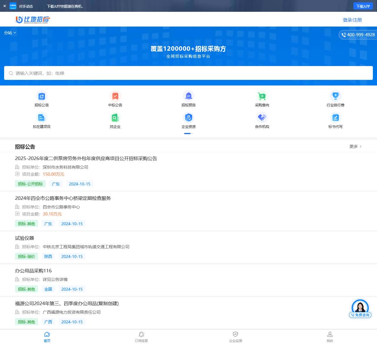 比地招标网m.bidizhaobiao.com是国内招投标大数据服务平台,每日更新180000条招标项目信息;比地招标网致力为政府、招标单位、供应商、招标代理机构提供精准的招标采购信息查询和相关服务。