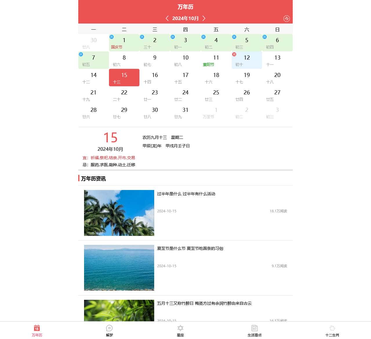 阅品万年历提供万年历查询,包括万年历农历日子查询,万年历农历转阳历,老黄历查询,黄历每日吉凶宜忌查询、农历查询、黄道吉日查询、时辰凶吉查询,提供免费搬家吉日查询、入宅吉日查询、结婚吉日查询、开业吉日查询等,以及24节气,节假日安排,周公解梦以及星座运势查询。2024年10月15日查询,2024年10月15日黄道吉日,2024年10月15日黄历,2024年10月15日黄历查询2019,2019年05月30日老黄历,老黄历2024年10月15日,2024年10月15日老黄历查询,2024年10月15日时辰吉凶宜忌。查日历,选吉日,找日期,就上天气网万年历。