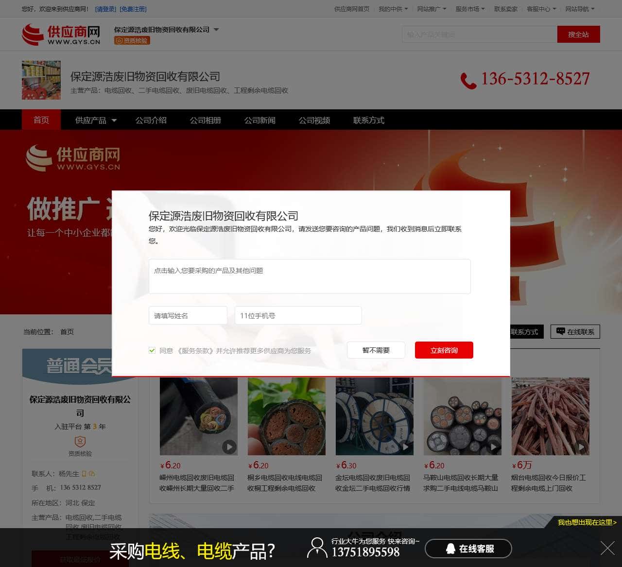 保定源浩废旧物资回收有限公司(https://yuanhaofeijiu666.gys.cn)主营产品包括电缆回收、二手电缆回收、废旧电缆回收、工程剩余电缆回收等,保定源浩废旧物资回收有限公司负责人杨先生,保定源浩废旧物资回收有限公司希望能与您成为合作伙伴