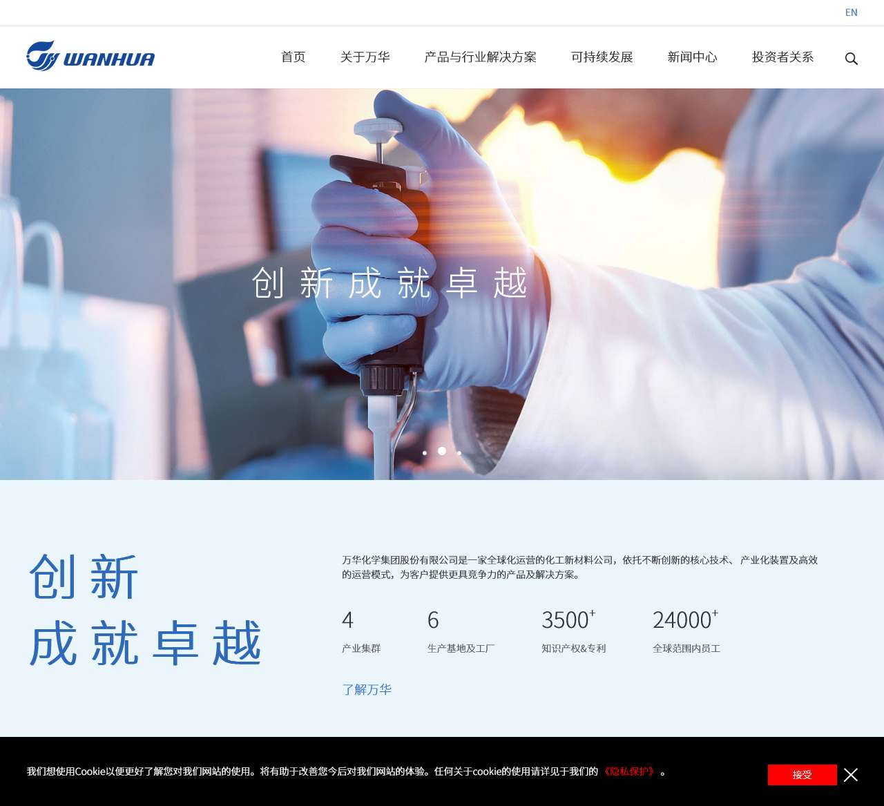 万华化学集团|化学,让生活更美好-万华化学集团股份有限公司是一家全球化运营的化工新材料公司,依托不断创新的核心技术、产业化装置及高效的运营模式,致力于为全球客户提供更具竞争力的产品及综合解决方案。万华化学秉承“化学,让生活更美好!”的使命,将一如既往地在化工新材料领域持续创新,引领行业发展方向,为人类创造美好生活!