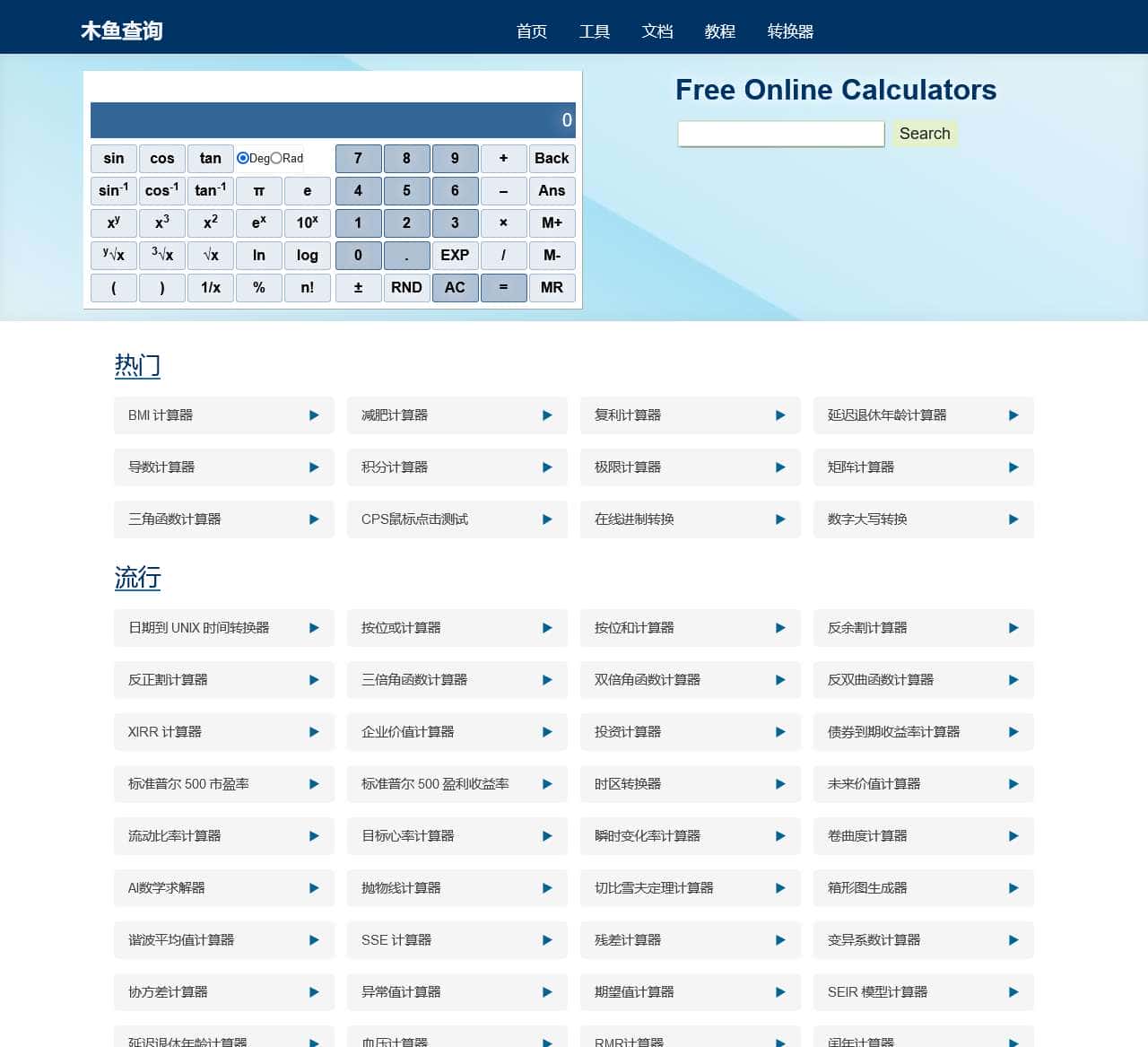 木鱼查询免费提供在线查询工具, 包括数学、金融、健身、工程、计算机等查询计算工具,每个计算器都可快速免费查询,无需注册。