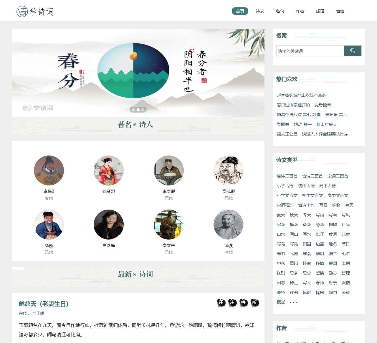 新安诗词网作为传承中国传统文化的网站,专注于提供古诗词、古文、古籍、名著等内容服务。新安诗词网设有诗文、名句、作者、古籍等相关栏目,致力于让古诗文爱好者更方便快捷地查阅古诗词、古籍等相关资料。