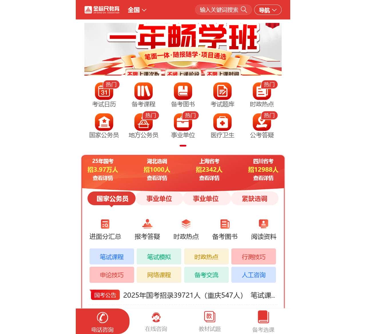 | 专项资料 | 招考公告、报考指南、笔试资料、笔试教材、笔试课程、笔试网课、笔试题库、人工客服 |