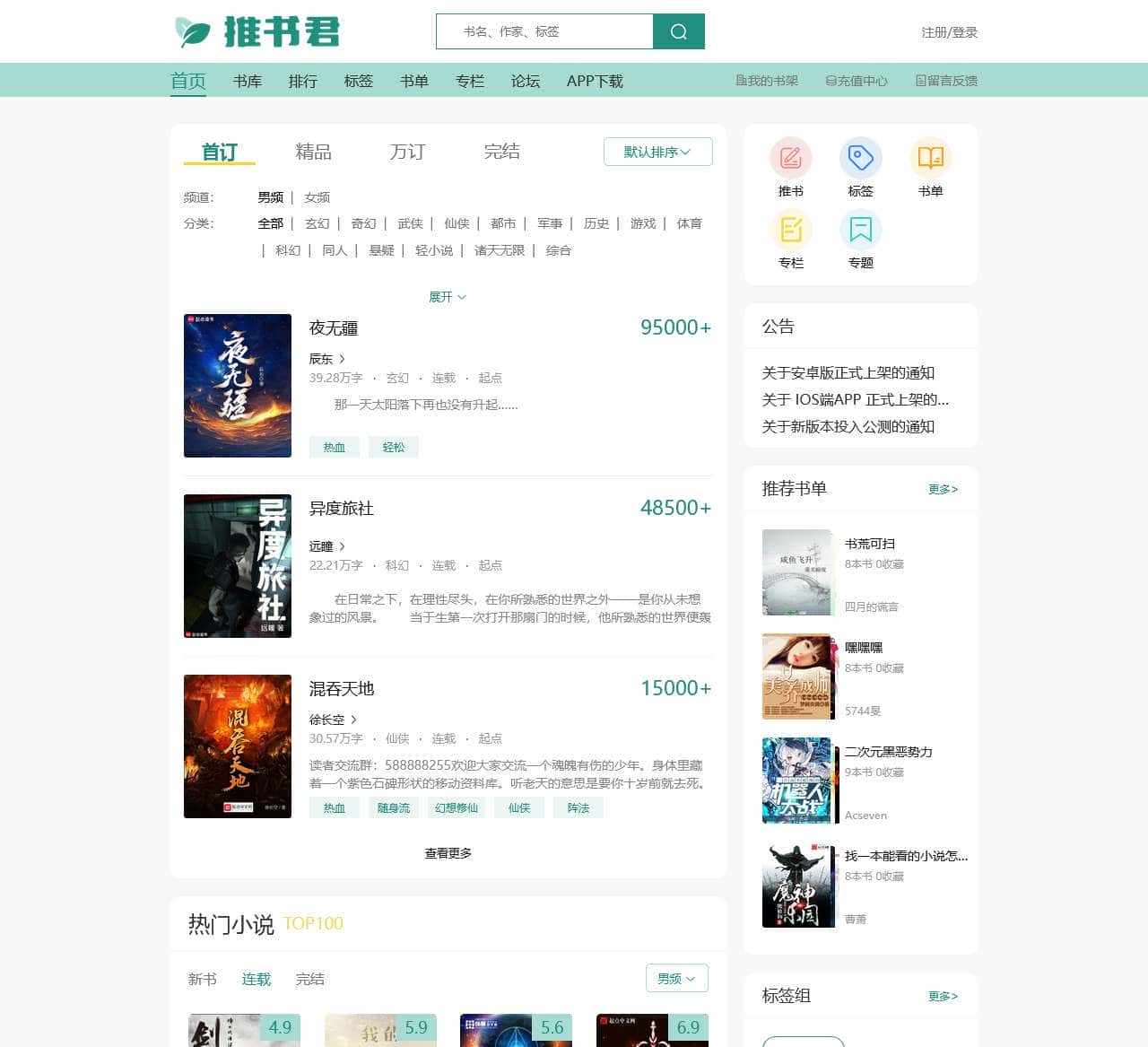 推书君致力于使用大数据和算法提供个性化网络小说推荐,目前已收录海量小说,上万标签,书荒求书、网络小说推荐就找推书君
