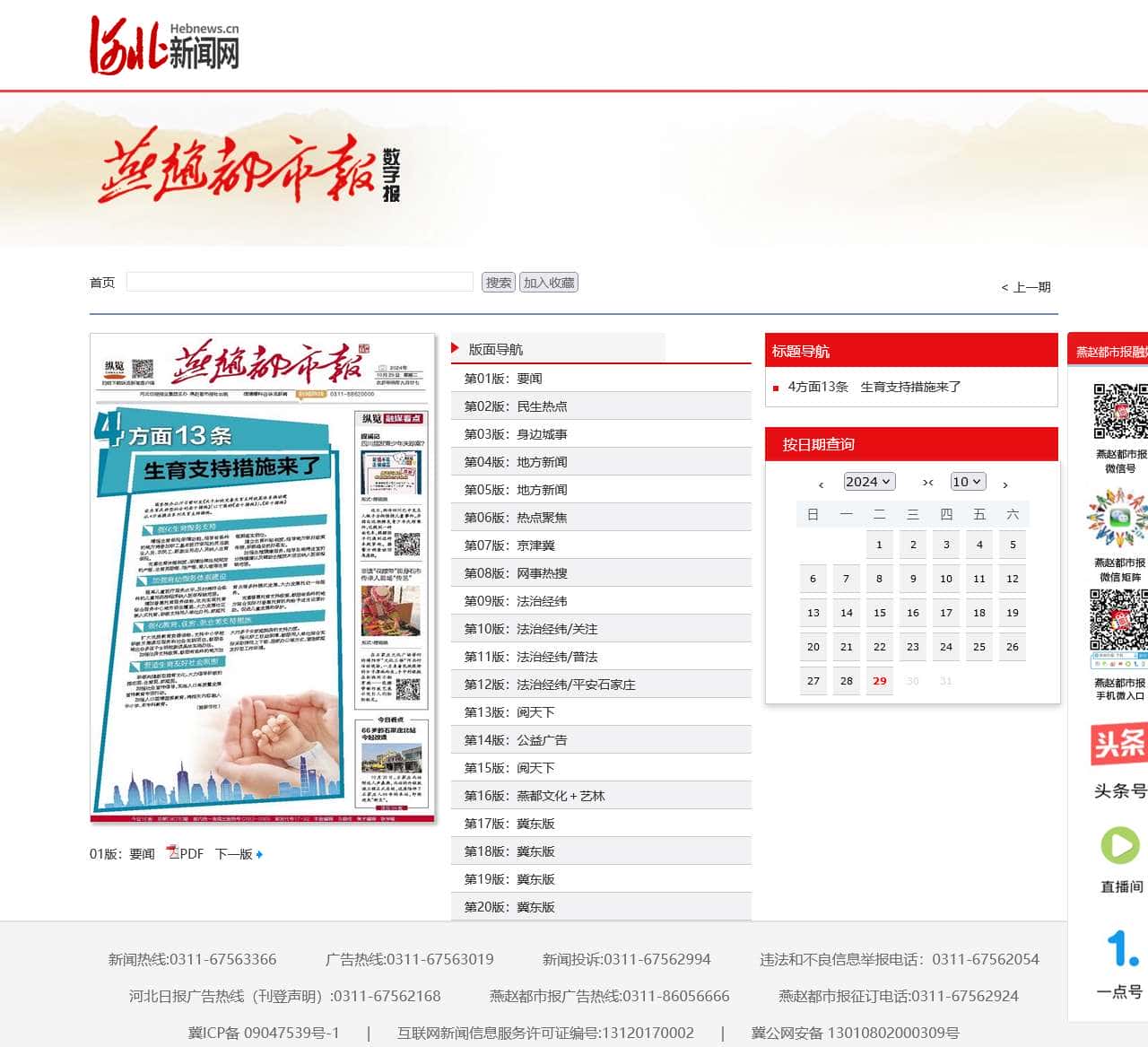 | 版块 | 第01版:要闻 第02版:民生热点 第03版:身边城事 第04版:地方新闻 第05版:地方新闻 第06版:热点聚焦 第07版:京津冀 第08版:网事热搜 第09版:法治经纬 第10版:法治经纬/关注 第11版:法治经纬/普法 第12版:法治经纬/平安石家庄 第13版:阅天下 第14版:公益广告 第15版:阅天下 第16版:燕都文化+艺林 第17版:冀东版 第18版:冀东版 第19版:冀东版 第20版:冀东版 |