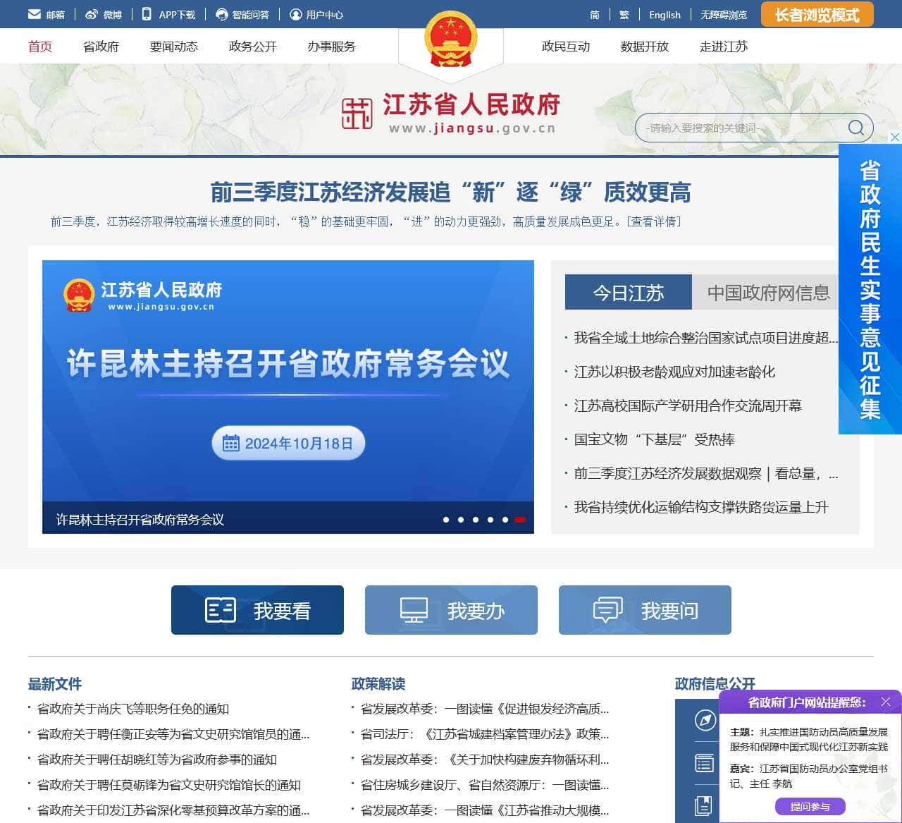 | 首页 | 省政府、要闻动态、政务公开、办事服务、政民互动、数据开放、走进江苏 |