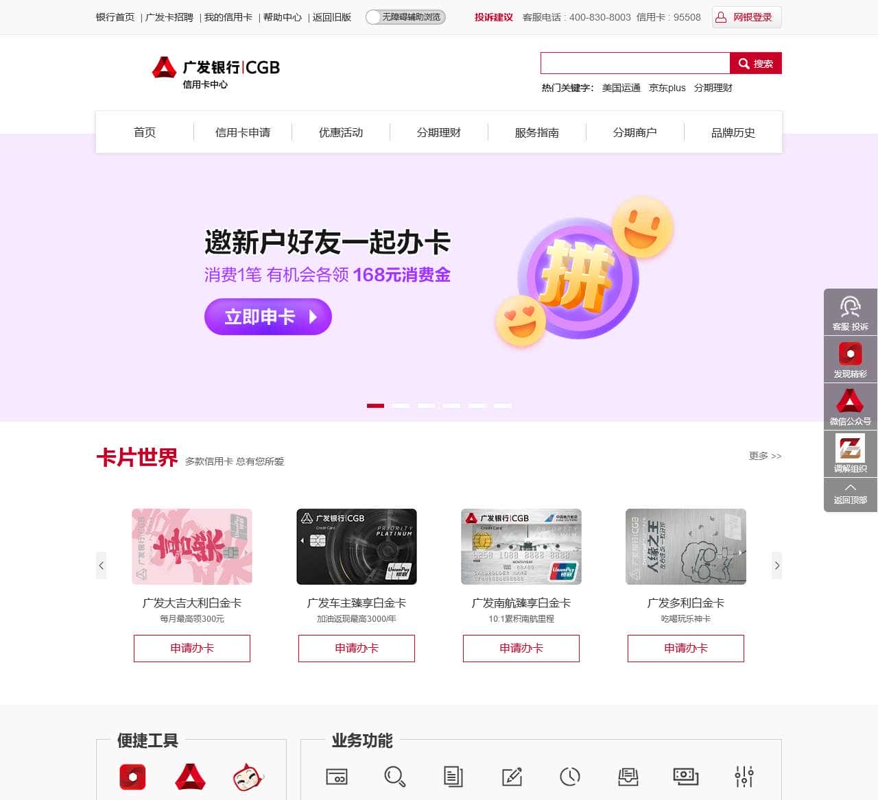 广发银行信用卡中心,提供在线免费办理申请广发信用卡业务,包括广发银行标准信用卡、联名信用卡、特色卡等多款信用卡供您选择,提供在线查询信用卡积分、额度、奖励等多项业务功能。想了解更多广发银行信用卡快速申请,办理信用卡活动、优惠等信息,首选广发银行信用卡中心官网。
