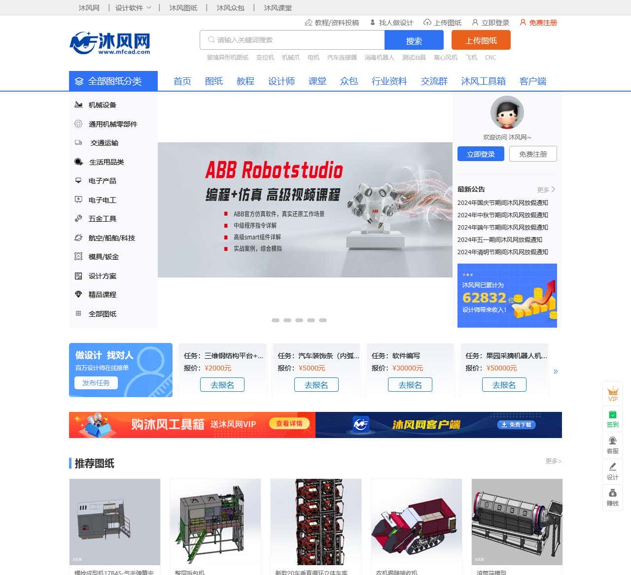 | 平台功能 | 沐风图纸, 沐风众包, 沐风课堂, 教程/资料投稿, 找人做设计, 上传图纸, 立即登录, 免费注册, 个人中心, 退出 |