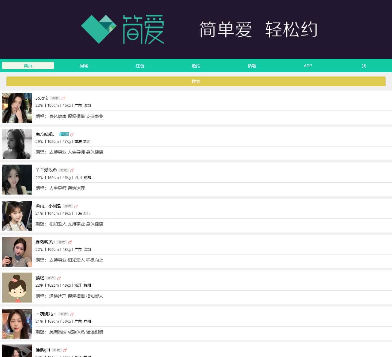 简单爱,轻松约;在简爱你可以获得朋友的关爱和生活帮助、事业援助;简爱帮助你改变寂寞、孤独、苦闷的现状,提升生活质量,活出精彩