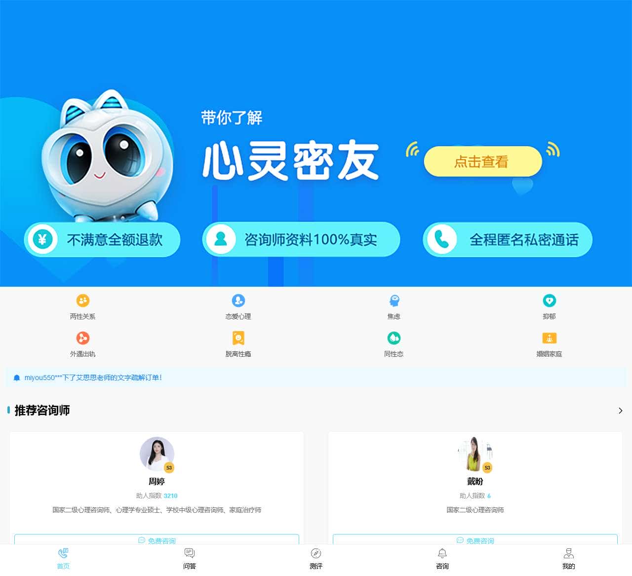 心灵密友由清华博士联合心理专家创办,为用户提供标准化在线心理咨询服务及心理测试量表。抑郁症、焦虑症、婚姻情感问题,就上心灵密友app,倾诉你的烦心事。