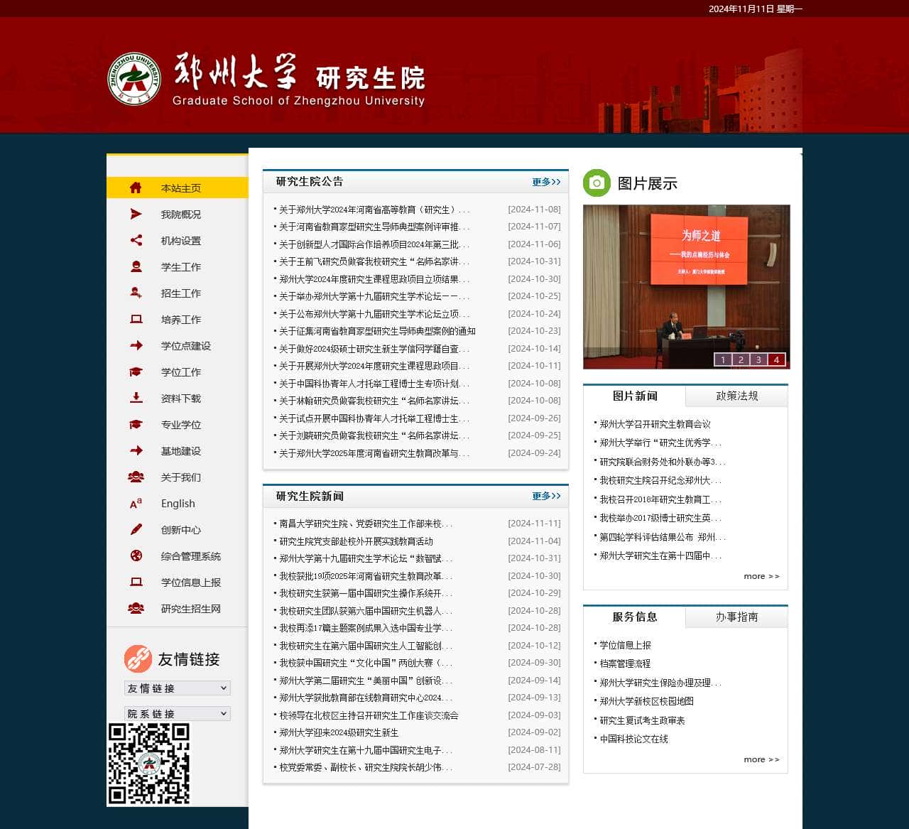 | 服务信息 | 办事指南:学位信息上报、档案管理流程、郑州大学研究生保险办理及理…、郑州大学新校区校园地图、研究生复试考生政审表、中国科技论文在线 |