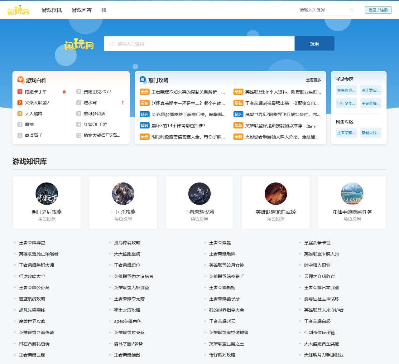 闲玩网,国内游戏门户网站。提供最新最全的网络游戏、网页游戏、休闲游戏、单机游戏玩法指南,实时分享游戏攻略、开服礼包、游戏排行榜等信息,为广大玩家提供最专业的游戏攻略与玩法技巧。玩游戏,就上闲玩网,想看什么就有什么!