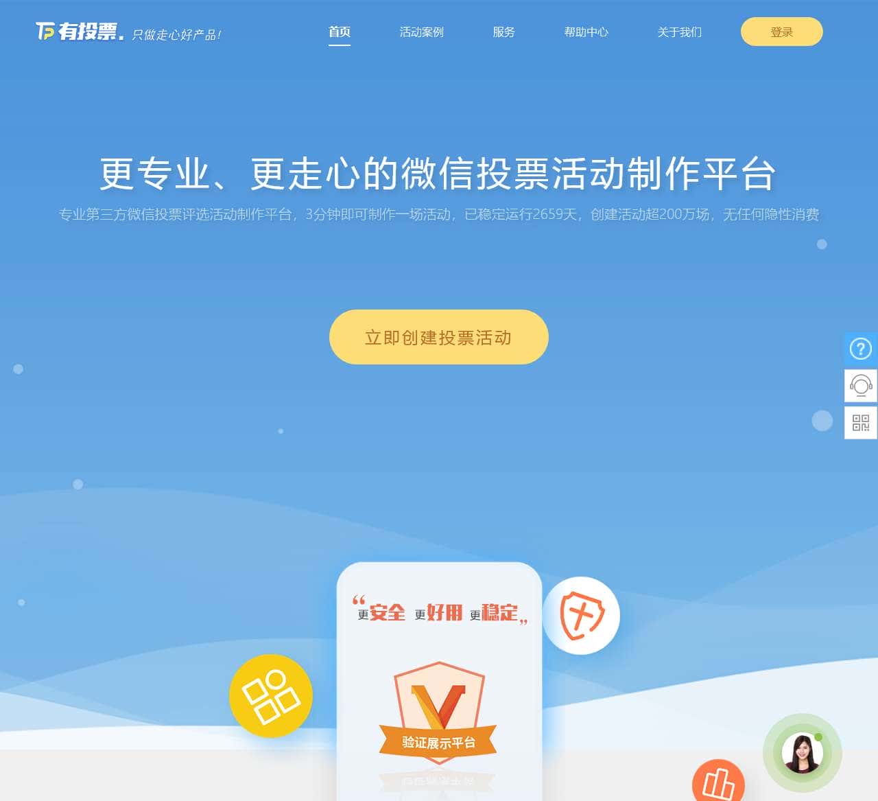 有投票微信投票托管平台是可快速创建微信投票网络投票活动的免费第三方投票系统, 手机投票, 高效吸粉, 极简主义设计理念, 三分钟搭建好一个投票活动, 视频投票, 图片投票等, 依托阿里云集群服务,超强稳定性保证.
