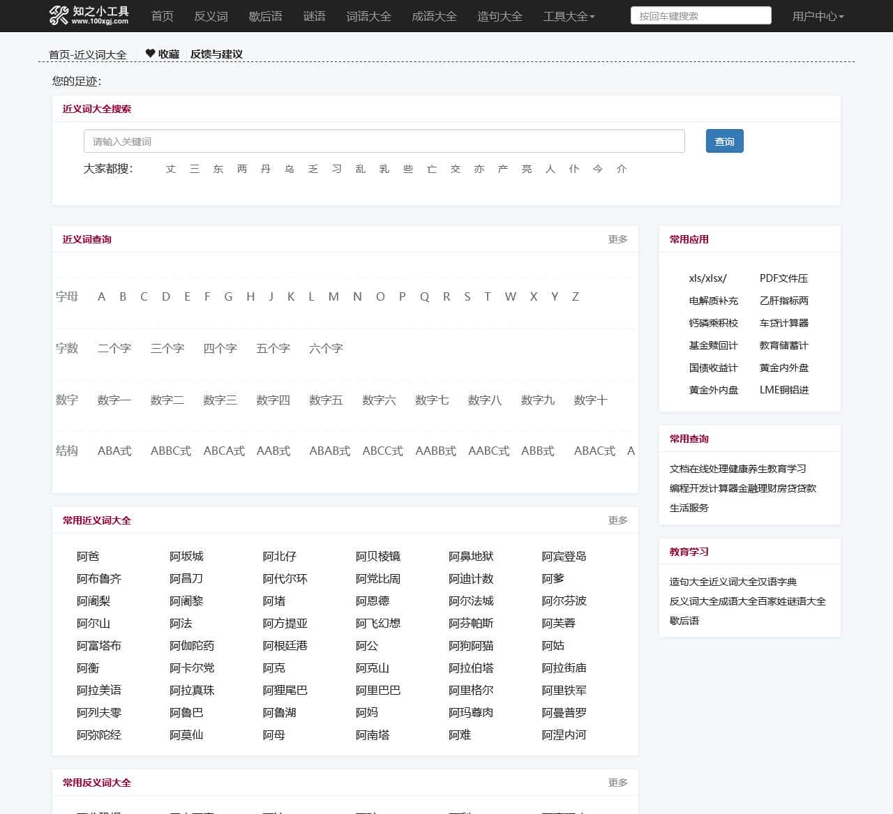 | 更多分类 | 健康养生, 教育学习, 编程开发, 计算器, 金融理财, 房贷贷款, 生活服务, 造句大全, 近义词大全, 汉语字典, 反义词大全, 成语大全, 百家姓, 谜语大全, 歇后语 |