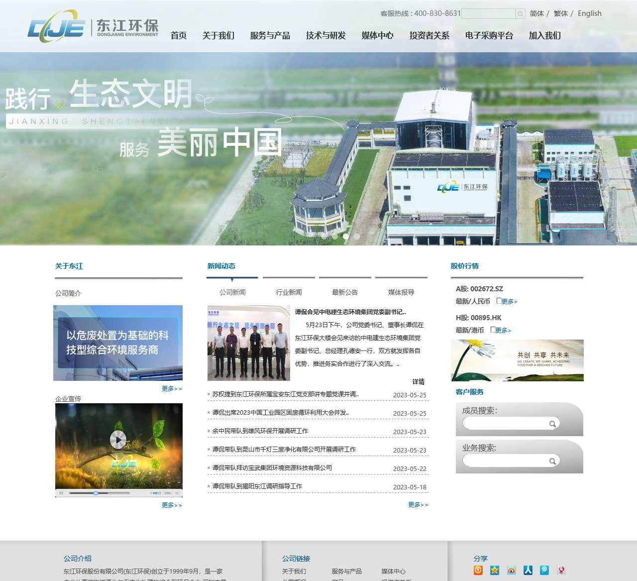 东江环保是一家成立于1999年9月的综合型环保企业,专注于废物资源化与无害化处理。作为深圳交易所和香港联交所上市公司(股票代码: SZ002672,HK00895),东江环保致力于保护环境、推动可持续发展。以下是该公司网站首页的内容整理: