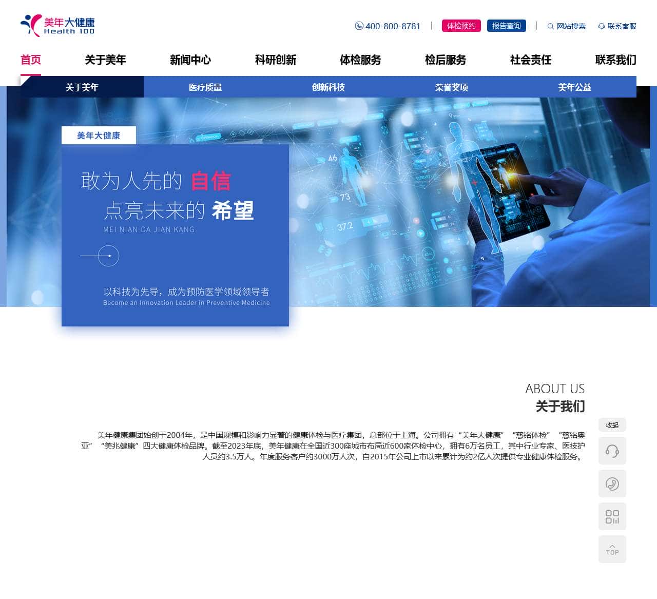 美年大健康体检中心为美年用户提供体检套餐购买、体检预约、体检报告查询,健康管理等,凭借数据赋能,发挥强孵化功能,正在构建具有强大影响力的健康产业核心生态圈,提供包括专科诊疗、慢病管理、基因检测、远程医疗、女性健康、中医治未病等多方位的增值服务。美年大健康体检中心遍布全国,在北京,上海,广州,深圳,杭州,南京,合肥,成都武汉,苏州等300余座核心城市布局600多家体检中心,已实现中国内地版图全覆盖。