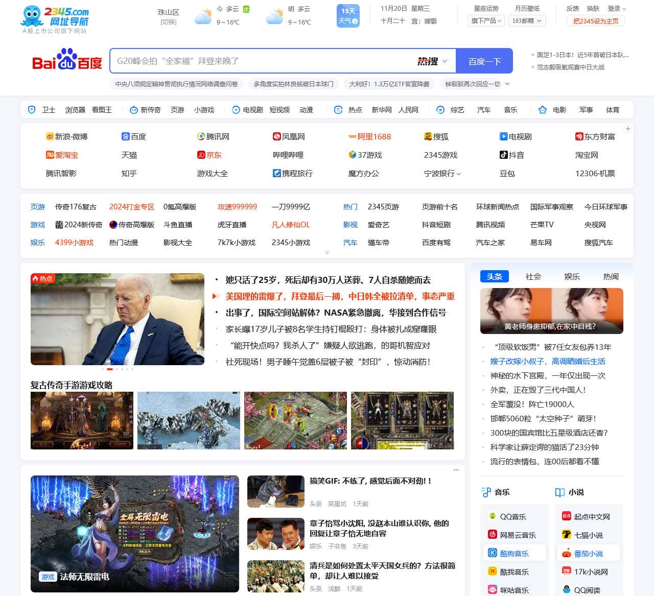 2345.com热门网址导航站网罗精彩实用网址,如音乐、小说、NBA、财经、购物、视频、软件及热门游戏网址大全等,二三四五网址导航提供了多种搜索引擎入口、实用查询、天气预报、个性定制等实用功能,帮助广大网友畅游网络更轻松。