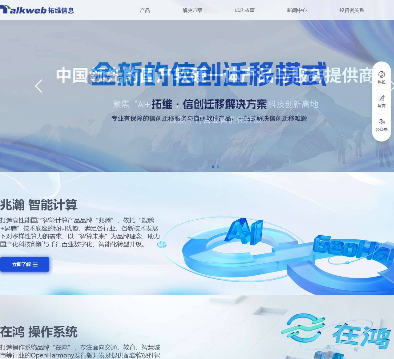 | 产品 | 智能计算产品、兆瀚台式机、兆瀚通用服务器、兆瀚人工智能产品、兆瀚软硬一体机、开源鸿蒙产品、在鸿操作系统、在鸿控制器、在鸿实验箱、在鸿学生终端 |