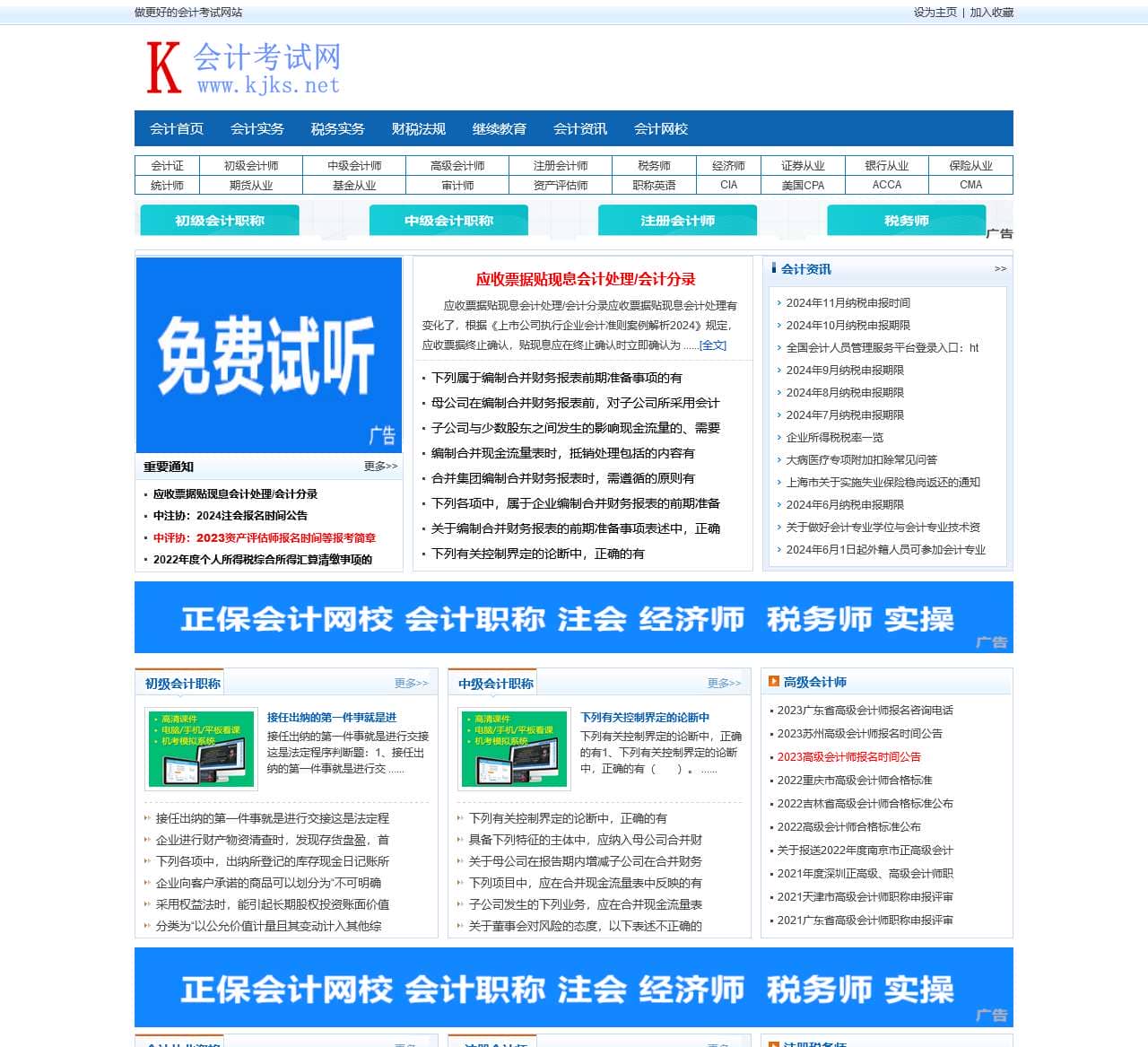 | 会计考试资讯 | 2024年注会报名时间公告、中评协:2023资产评估师报名时间公告、税务师、经济师、证券从业等各类考试的报名时间和相关资讯 |