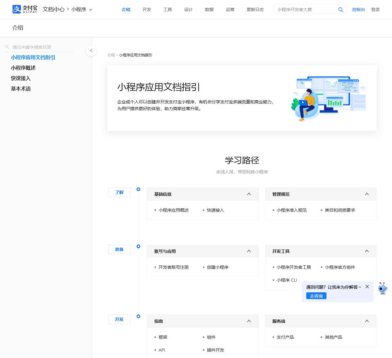 | 介绍 | 小程序应用文档指引、介绍、小程序应用概述、快速接入、小程序准入规范、类目和资质要求 |