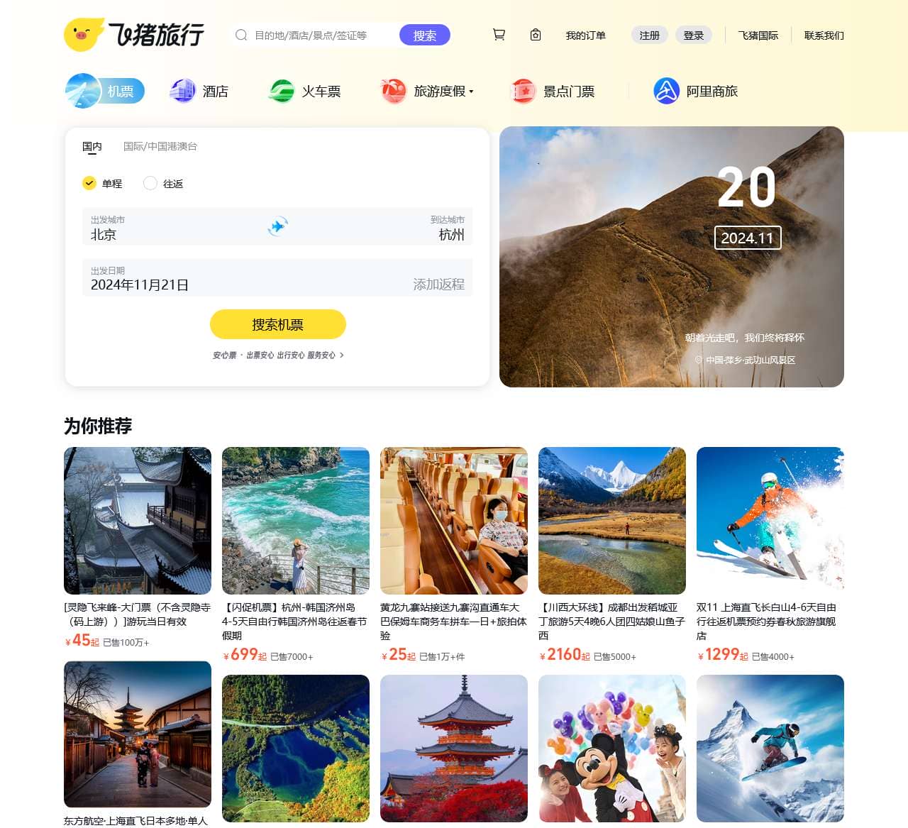 飞猪是阿里巴巴旗下的综合性旅游出行服务平台。飞猪整合数千家机票代理商、航空公司、旅行社、旅行代理商资源,直签酒店,客栈卖家等为广大旅游者提供特价机票,酒店预订,客栈查询,国内外度假信息,门票购买,签证代理,旅游卡券,租车,邮轮等旅游产品的信息搜索,购买及售后服务。全程采用支付宝担保交易,安全、可靠、有保证。