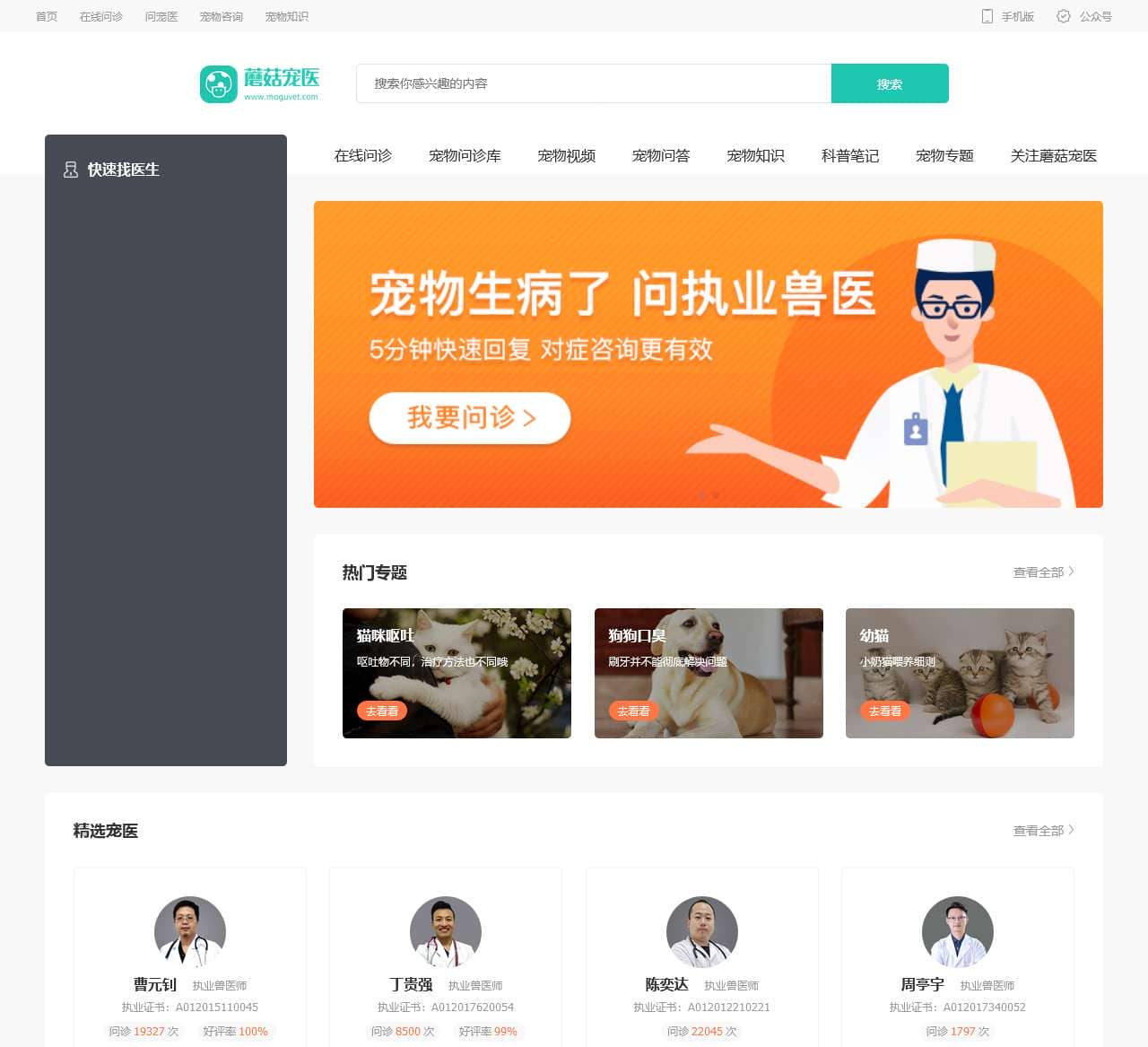 宠物医生在线咨询,就上蘑菇宠医,这里有资深兽医在线咨询和解答,为有宠物医疗需求的宠主提供宠物医院医生在线问诊服务,还提供宠物饲养知识,宠物日常用品与药品购买,宠物医疗常识等。
