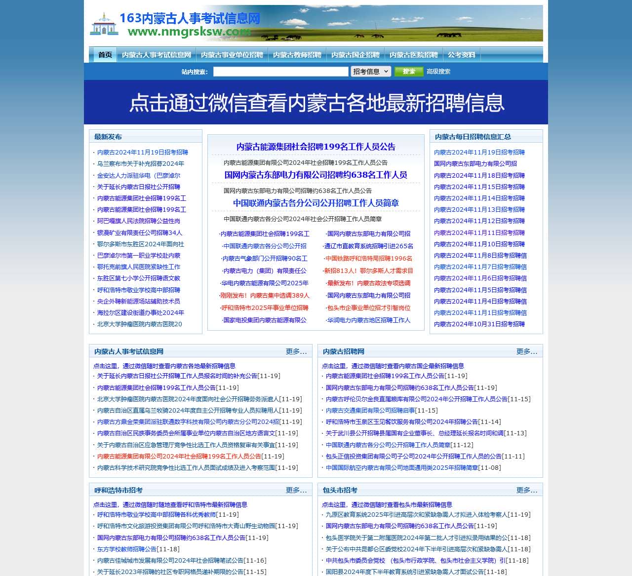 内蒙古人事考试信息网(www.nmgrsksw.com),又名163内蒙古人事考试信息网(www.nmgrsksw.com),及时分享内蒙古各地区公务员考试、事业单位招聘、教师招聘、医生招聘、三支一扶、特岗教师、政法干警等招考招聘信息。