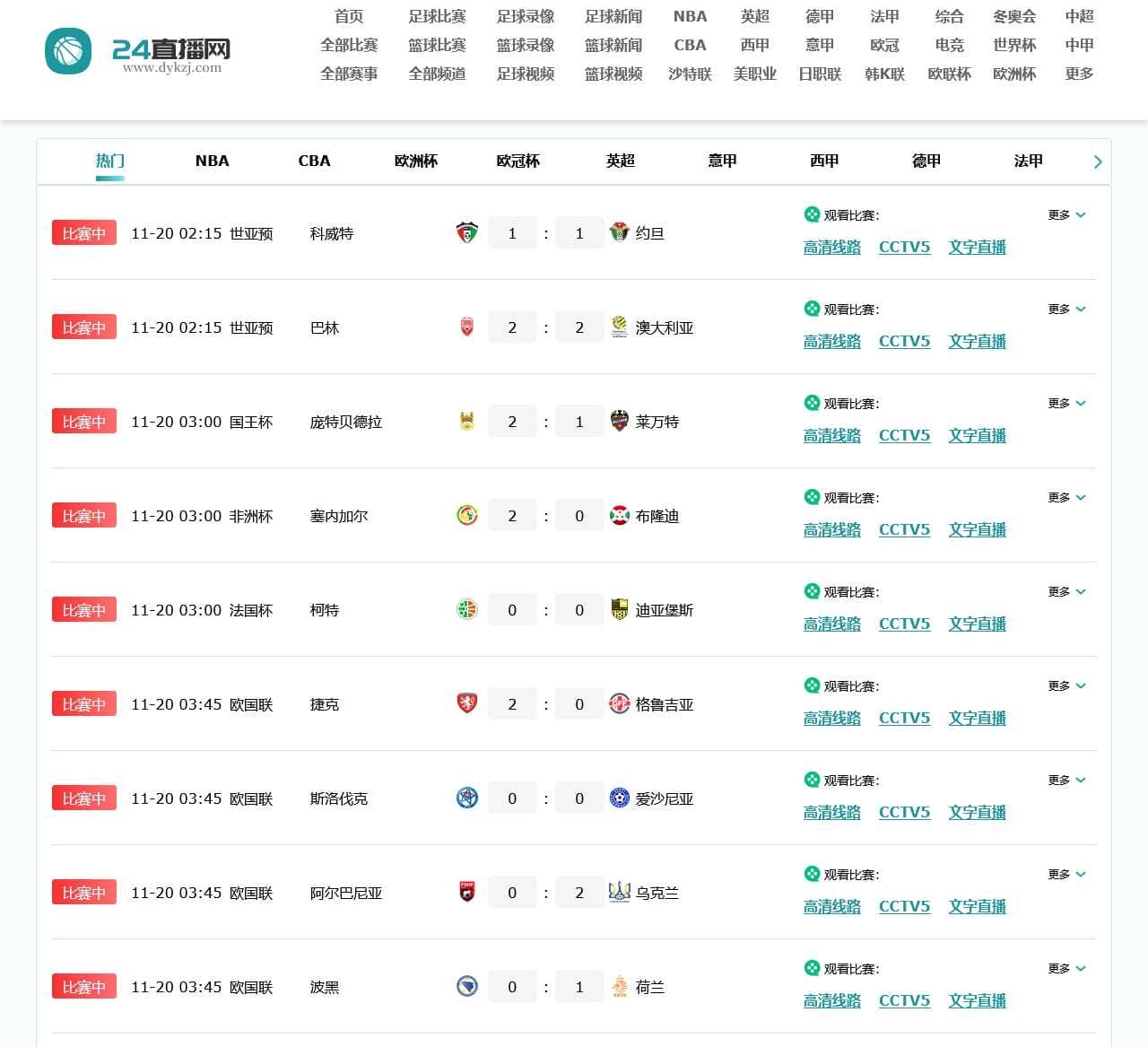 | 比赛中 | 法国杯 | 柯特 vs 迪亚堡斯 | 0 : 0 | 高清线路, CCTV5, 文字直播, 比分直播, 动画直播, 腾讯体育, 咪咕体育, 爱奇艺体育, PP体育, 新浪体育 |