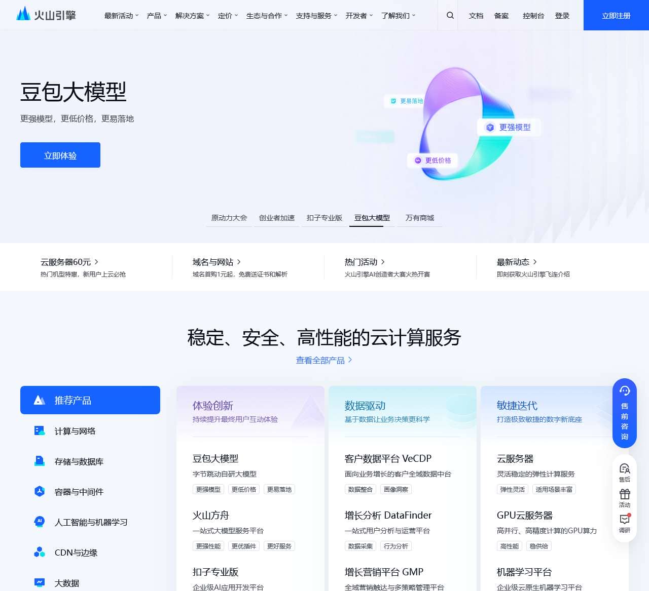 | AI与机器学习 | 豆包大模型、火山方舟、扣子专业版、机器学习平台、业务风险识别、智能美化特效等 | 提供AI、大模型服务、机器学习平台、业务风险识别、图像渲染与AR营销等服务。 |