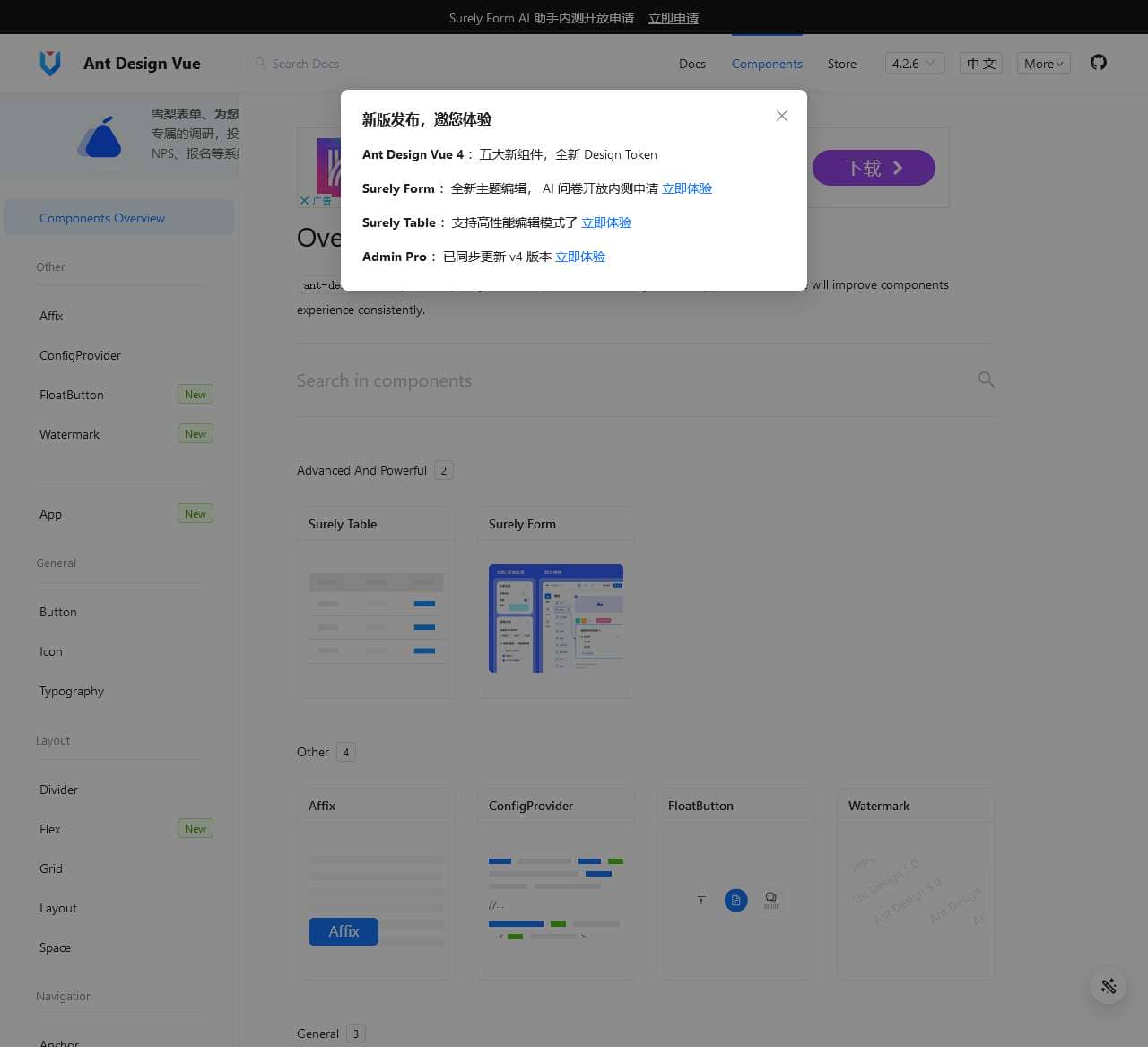 | 附加工具 | Affix, GitHub, Ant Design, Ant Design Awesome, AntD Library, Change Log, Bug Report, Vue, Vue CLI, Vite, @formily/antdv, AntV, Egg |