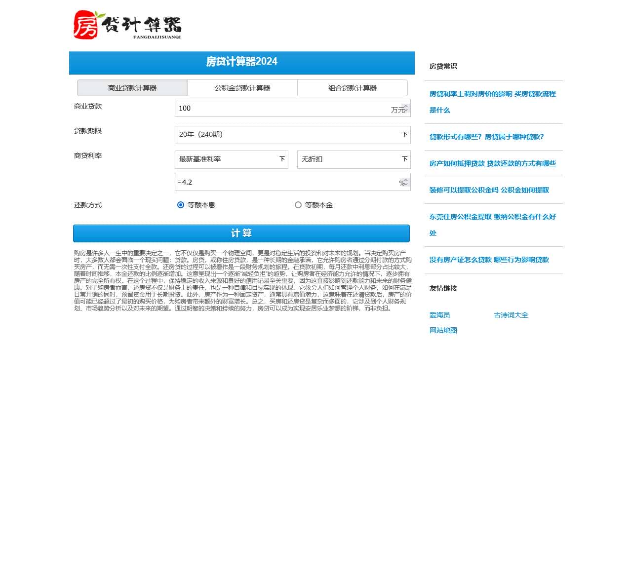 房贷计算器2024年最新版包含有:商业贷款计算器、 公积金贷款计算器 组合贷款计算器 商业贷款 最新房贷利率计算公式:LPR利率 + BP基点(10BP=0.1%)