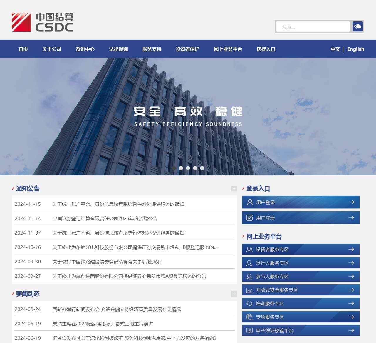 | 网上业务平台 | 投资者服务专区、证券查询服务、持有人大会网络投票、发行人服务专区、发行人在线业务办理系统、持有人大会网络投票、参与人服务专区、结算参与机构管理平台 |